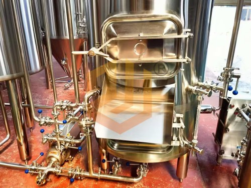 精釀啤酒設(shè)備使用的過濾槽與旋沉罐:采用上下兩層的設(shè)計(jì)方式,整體占地面積小,過濾槽采用銑制篩板,頂部采用異型人孔設(shè)計(jì),側(cè)面配有出糟口,方形人孔門設(shè)計(jì)更有利于啤酒麥糟的清理工作,同時(shí)還配有出糟板。內(nèi)部配有耕刀裝置,用于疏松麥糟層以及出糟使用。